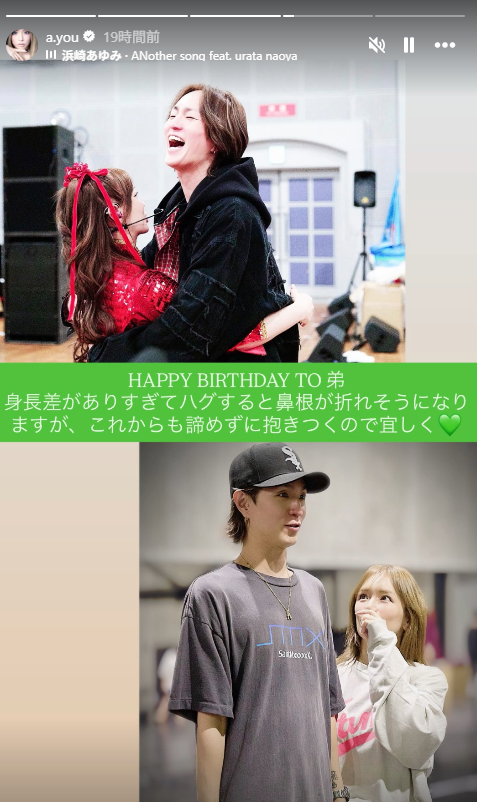 歌手の浜崎あゆみさんが11月11日、Instagramストーリーズを更新。「ハッピーバースデー TO “弟”」とコメントを添え、“弟”とハグするショットを投稿し、反響を集めています。