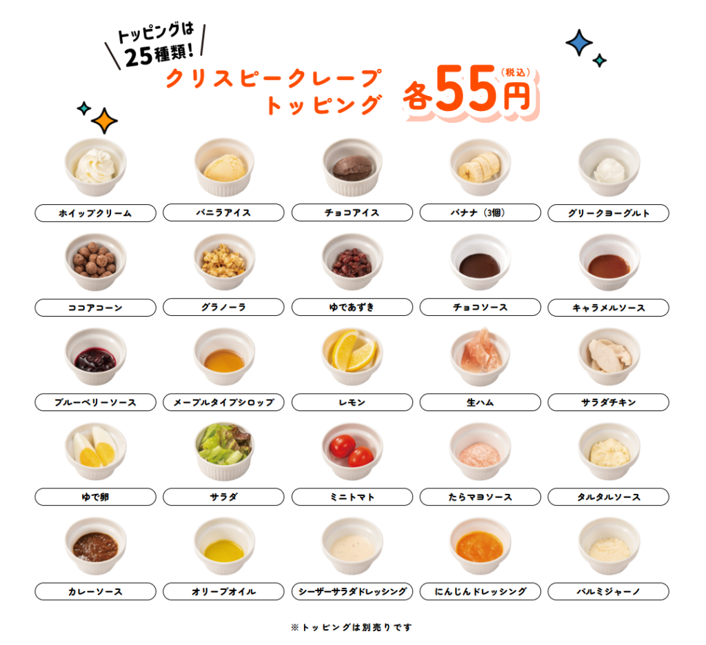 25種類の追加トッピングで、好きなクレープにカスタマイズできちゃう。