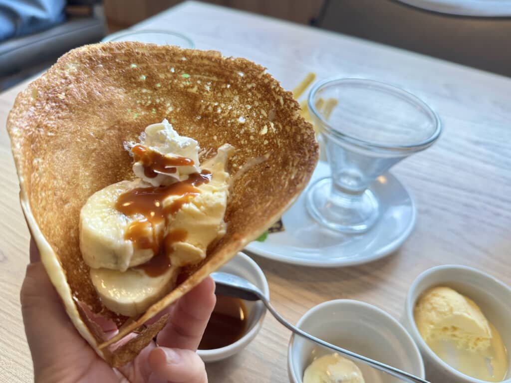 筆者はミニクリスピークレープとミニフライドポテトのセットで、キャラメルソースとホイップクリームをトッピングに選択、さらにバニラアイスとバナナを追加しました! キャラメルバナナ味をたっぷり楽しみつつ、時々ポテトもつまんでいく、甘さとしょっぱさのベストコンビネーションです。