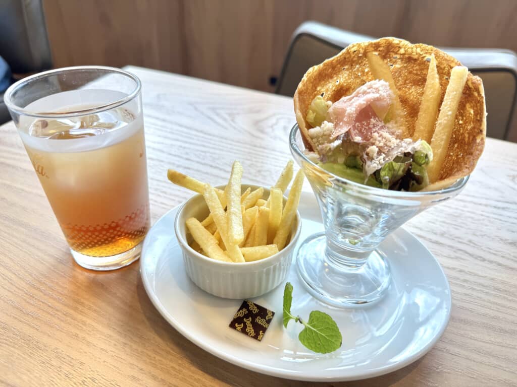いっぽう別メンバーは、同じくミニクリスピークレープとミニフライドポテトのセットで、トッピングにはサラダと生ハムを選択。追加注文でパルミジャーノも加えて、なんとフライドポテトごとクレープで挟んで食べていました! なるほど、こういう組み合わせ方もあるのか……。