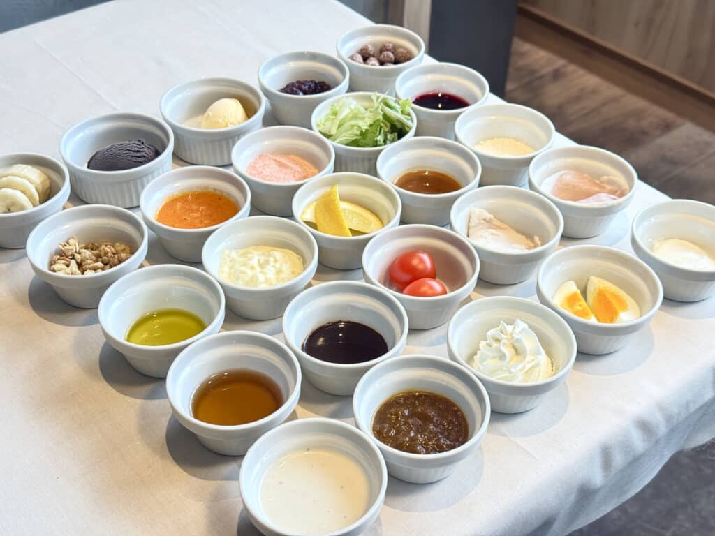 トッピングは各55円で全25種類。ホイップクリーム・バニラアイス・チョコクリームなどのスイーツ系から、サラダ・生ハム・たらマヨソースなどのごはん系トッピングまで幅広いラインアップです。