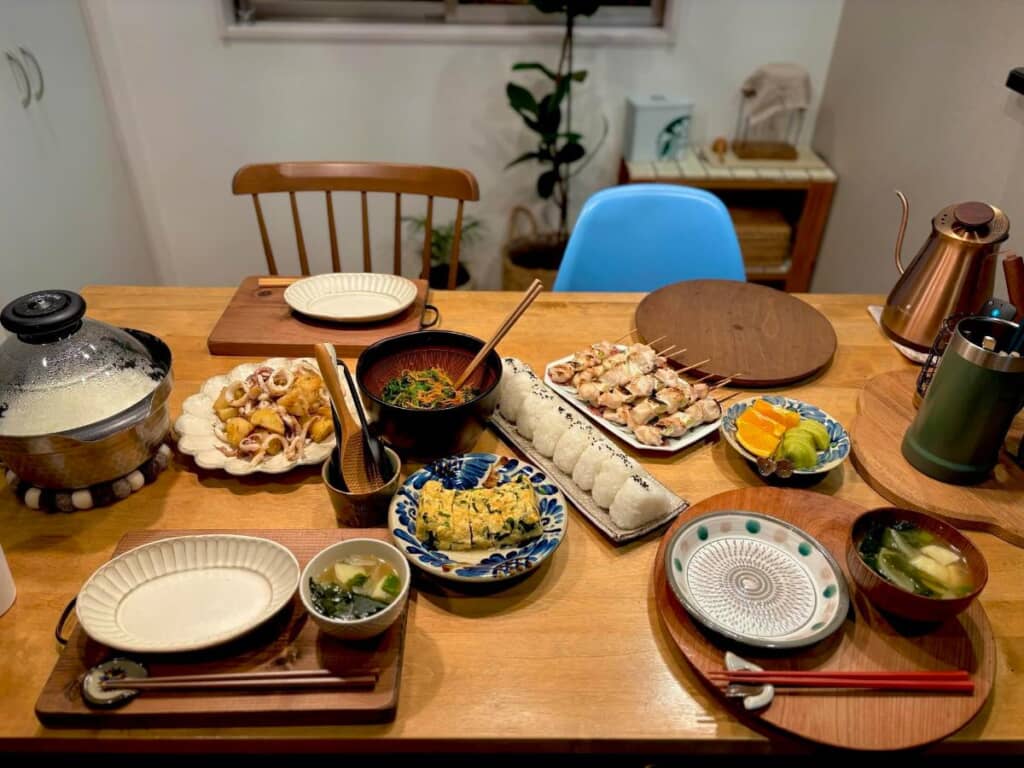 そして、豪華な家ごはんが完成! ダイニングテーブルには、塩麹漬け鶏胸肉の焼き鳥、イカとじゃがいものガーリックバター、キムチとニラの豆腐卵焼き、ほうれん草と人参の胡麻和え、味噌汁と塩握りなど、おいしそうな和食がずらりと並びます。