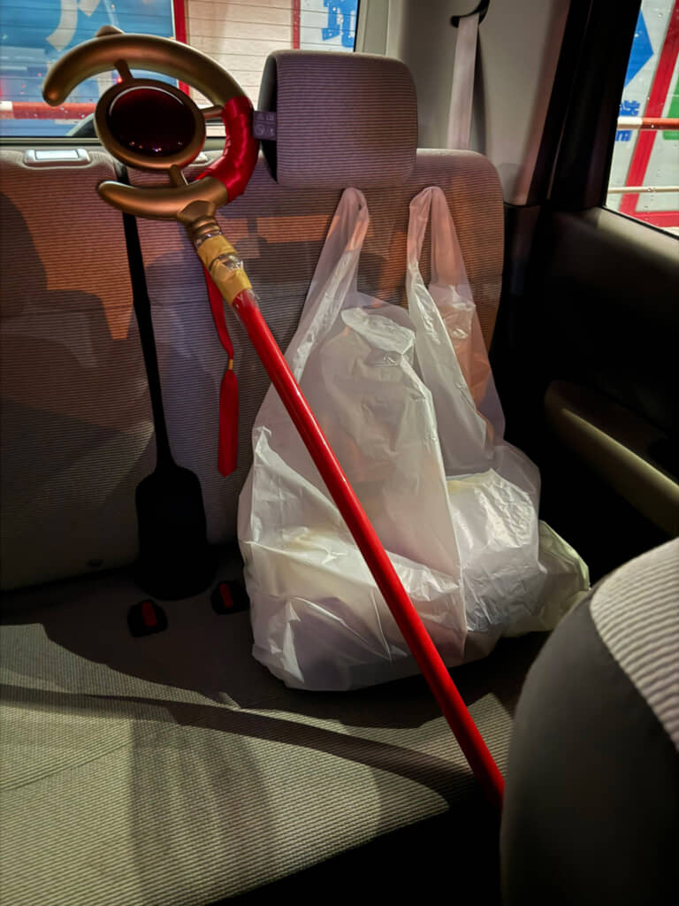 車内には、神秘的な見た目の細長い杖と大きなビニール袋が。約1メートルはありそうな長さで、持ち手は赤く先端は金色で丸い特殊な形をしています。