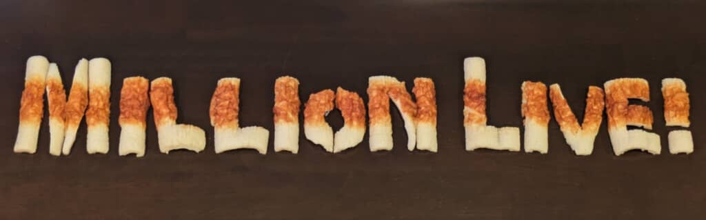 完成したちくわ版ミリオンライブのタイトルロゴは、想像以上に本家のフォントにそっくり! 大きく強調されたMとL、特徴的な丸みがあるOなど、英字のスタイルをしっかりと再現しています。