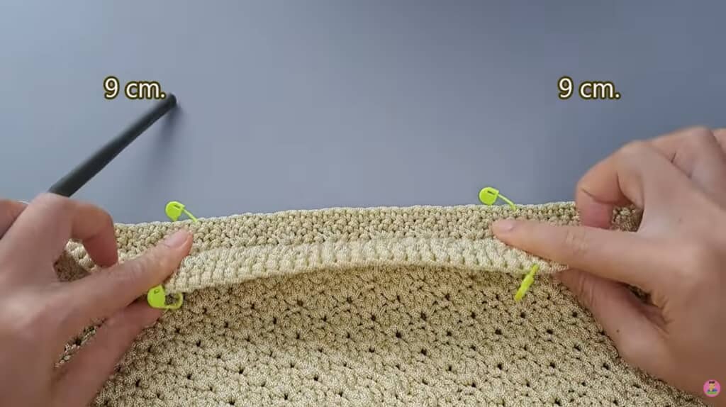 29段目を引き抜き編みで閉じたところから、くさり編みで1目、こま編みで1目編み、すじ編みでマーカーを付けた場所まで編み進めます。そこから、くさり編みを90目作り、持ち手の最初の段とします。同じ前胴の左から右のマーカーにつなげ、今度は背胴のマーカーを付けたところまで編み進めます。また同じようにくさり編みを90目作り、持ち手の最初の段にします。