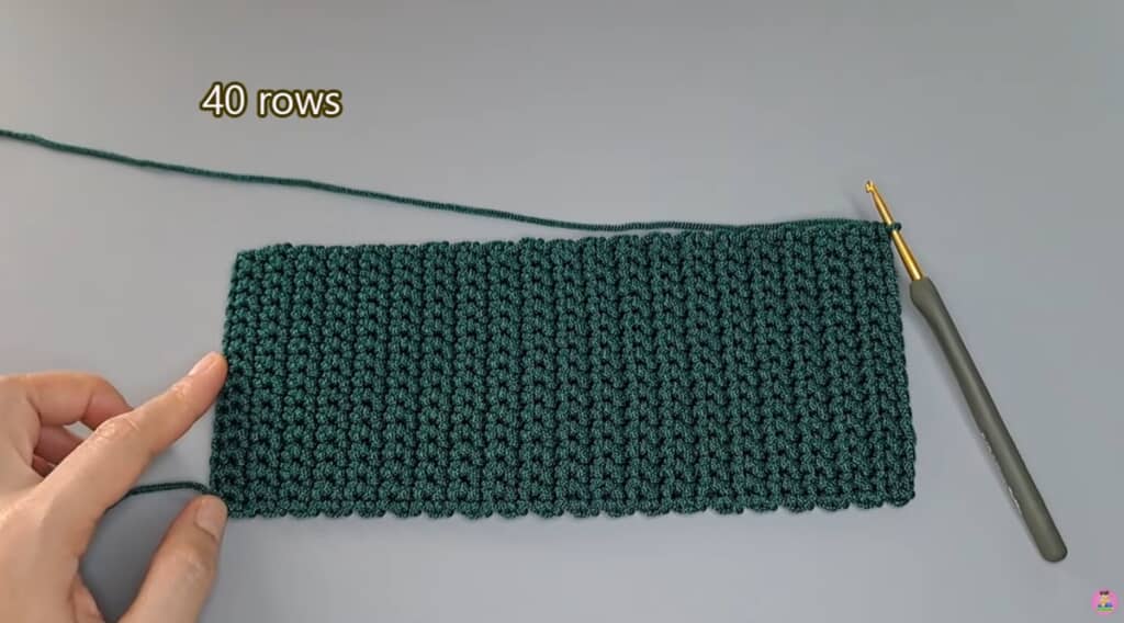 まず、最初のスリップノットを作り、くさり編みを15目編みます。立ち上がりのくさり編みを1目編み、折り返して次の段からはこま編みで編み進めていきました。そしてまた立ち上がりのくさり編みを1目編み、こま編みで編み進める、という工程を40段まで繰り返します。すると、縦10センチ・横23センチほどの長方形ができあがりました。