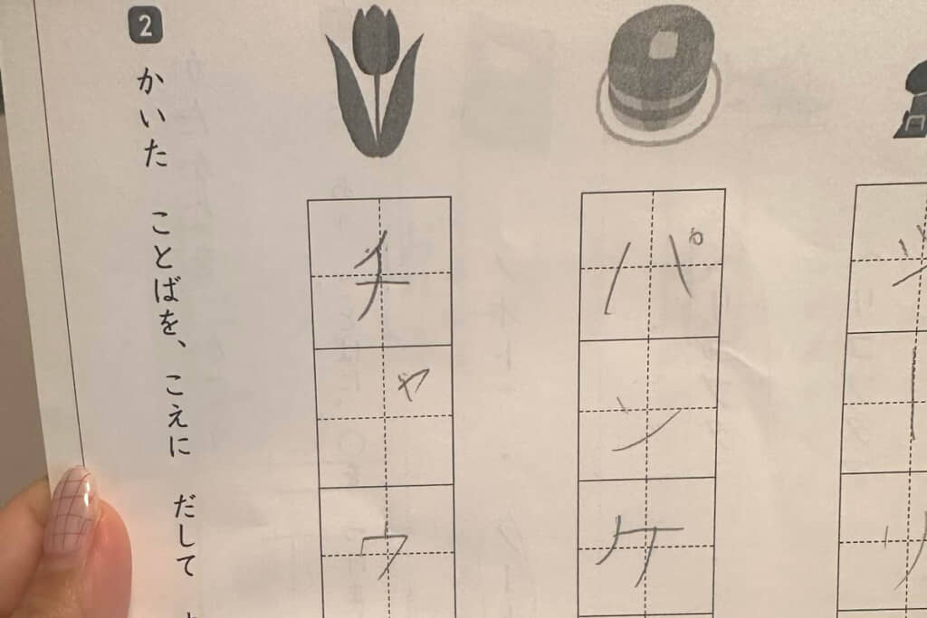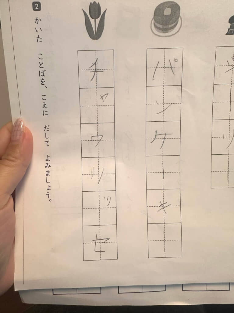 そこに描かれていたのは、ホットケーキとチューリップの絵です。娘さんは、ホットケーキを「パンケーキー」と解答。パンケーキでは1文字足りず、無理やり最後を伸ばして6文字に強引に調節しています。また、チューリップは、「チャウリッセ」。間違っているけど、語感が似ていてなんだか惜しいような……?