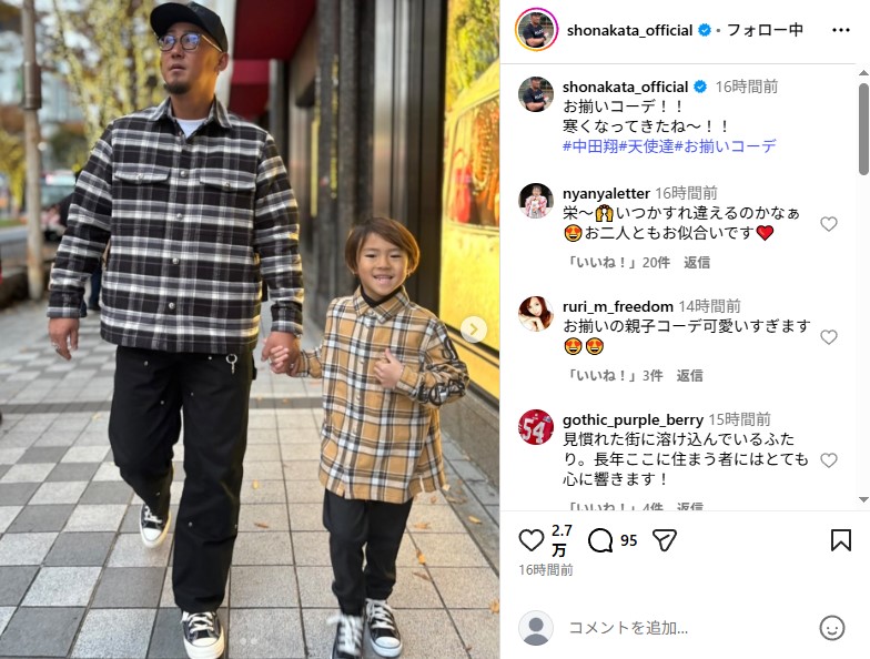 元プロ野球選手の中田翔さんが11月17日にInstagramを更新。6歳長男・力翔(りきと)くんとペアルックで歩く親子ショットを公開しており、ファンからは「かっこいいパパです」「お父さんに似てきたねー!」などの反響が寄せられています。