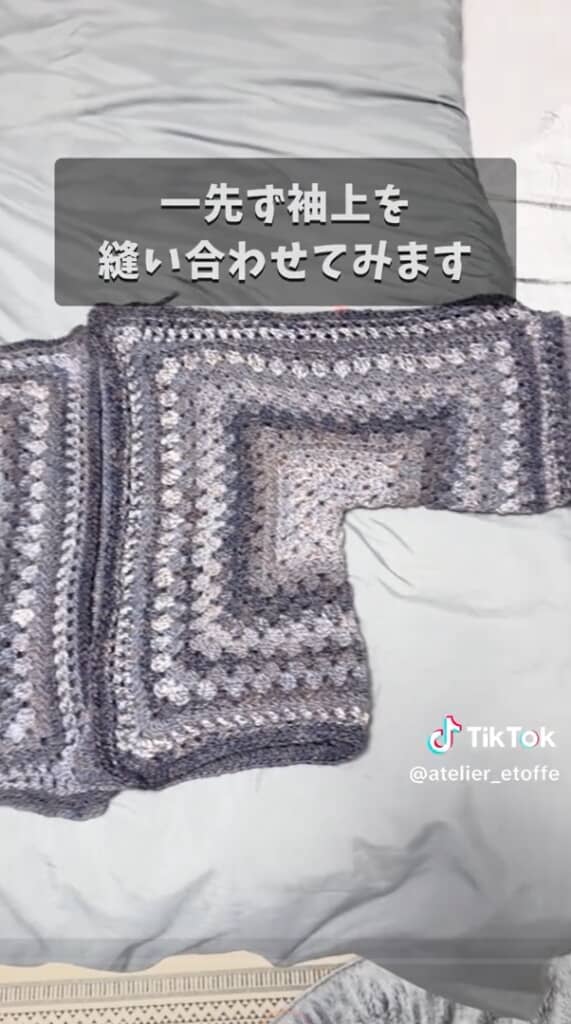 完成した六角形は半分に折ると、“くの字”のような形になりました。この2枚をつなぎ、閉じることでヘキサゴンカーディガンが完成するのですが、その前に袖と裾の丈を伸ばすか悩むけだまさん。しかし、ここはひとまず袖上を縫い合わせてみることに。6辺のうち、どの辺を袖上に持ってくるかで少し雰囲気は変わるようで、けだまさんも柄の出方が好きなところを合わせ、六角形の表どうしを合わせたら引き抜き編みで袖上を閉じました。
