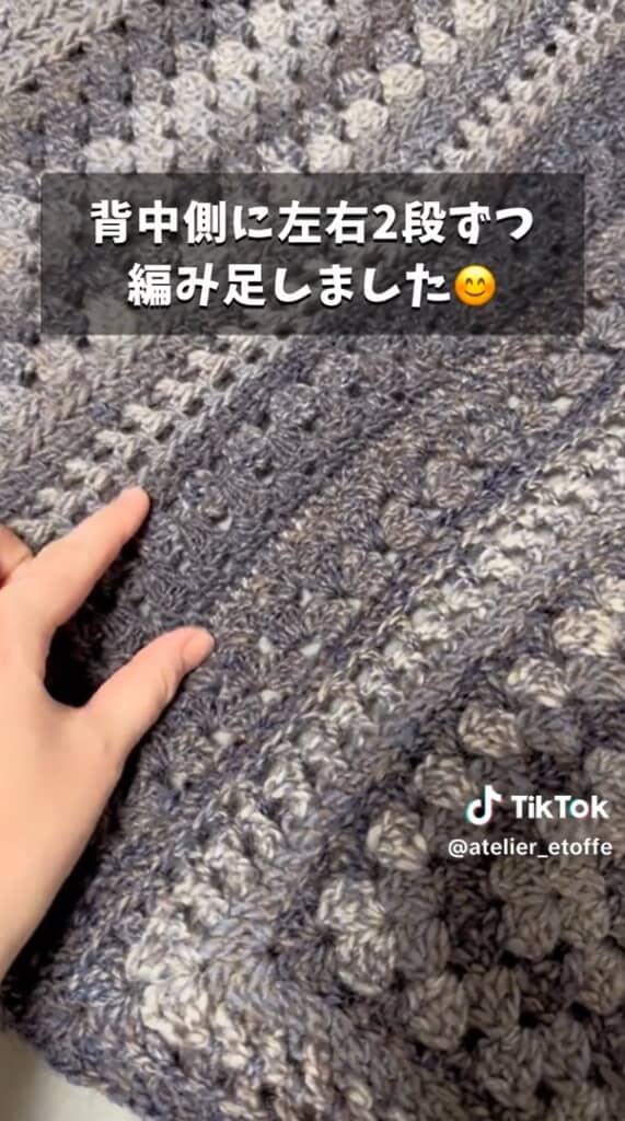 まず背幅を足すために、背中側を左右それぞれ2段ずつ編み足しました。けだまさんとしては、部屋着として暖かく羽織ることが目的なので、ゆったりとリラックスできるサイズ感を目指しているようです。