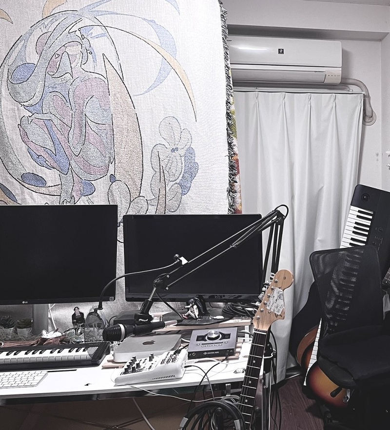 部屋の左側には白いデスクが置かれ、上にはPCやオーディオインターフェース、マイク、キーボード、側にはギターと、音楽制作に必要なツールがたくさん並べられています。後ろにかけられた敷物の裏には、友人2人が作った防音室があるそうです。そして右側には……?