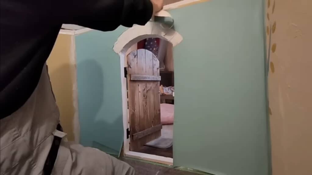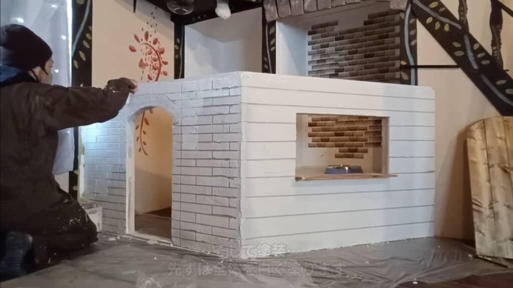キッズハウスとして使うのは自宅の一角。角をうまく利用して壁の材料を節約しています。用意した壁2枚を設置してから、石膏パテを使ってレンガ作りの家をイメージした模様を描いていきます。