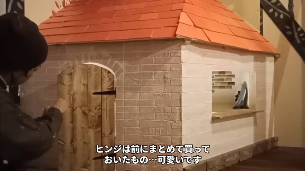 木目がきれいな手作りドアを設置したら、まるで絵本の中から飛び出してきたような小さな家ができました。メルヘンな雰囲気で娘さんもよろこんでくれそうですが、まだまだ作業は続きます。