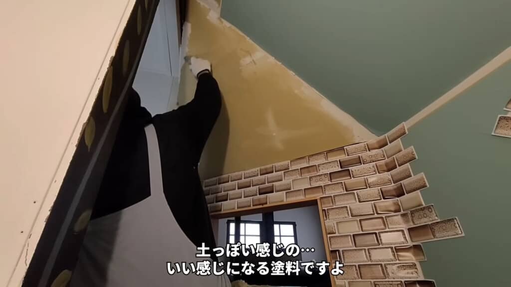 ドアを取り付けた壁側には、グレイブルーの淡い色合いの壁紙を貼り付けます。窓がある壁側は、レンガ作りをイメージしたタイル風シートを貼っていき、直上の屋根裏は黄土色の塗料を厚く塗っていきます。