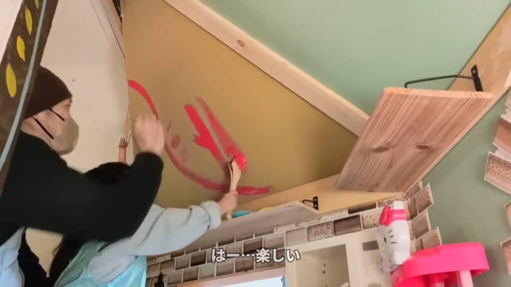 その後、小さな家の中に子どものおもちゃを運び込み、棚の追加や補強を終えたら、仕上げとして黄土色に塗装した屋根裏に娘さんに一緒にお絵かきしてもらうことにしました