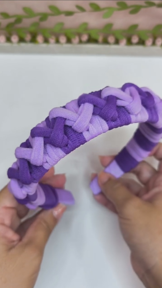 最後に、ループ部分を端から最後まで交互に斜めに通していくと……きれいに編み込んだような仕上がりになりました! 最後のループはカチューシャの端に通して外れないようにします。