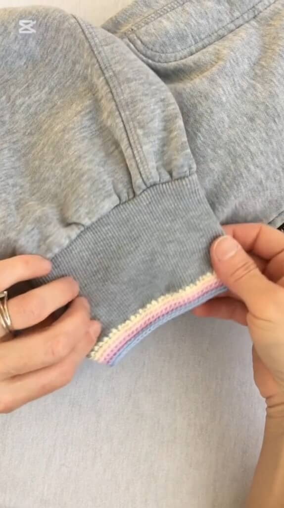 (1/4)裾がほつれたスエット。かぎ針で生地に0.5ミリ間隔の穴を開け、両の裾をぐるりと1周します。