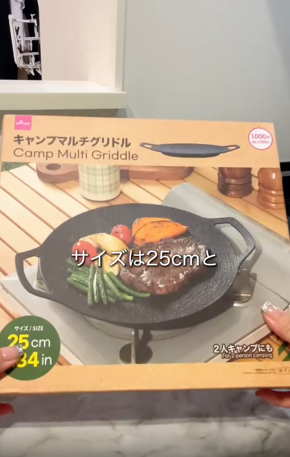 ダイソー公式Instagramアカウント(@daiso_official)が紹介したのは、「キャンプマルチグリドル」を使ったレシピです。同商品は薄い円盤状の調理器具で、ソロキャンプにぴったりな「20センチ(770円)」のほか、2人でのキャンプにも使える「25センチ(1100円)」も展開。フッ素加工で焦げつきにくいとしています。