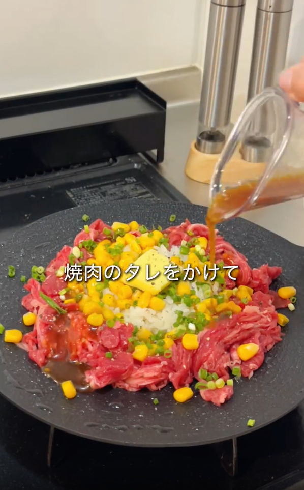動画では、「アウトドアではもちろん、おうちごはんにも大活躍」として、この「キャンプマルチグリドル」を使った「簡単背徳レシピ」を2つ紹介。1つ目はペッパーライスです。マルチグリドルにサラダ油をひき、ご飯、牛肉、コーン、ネギ、バター、黒コショウをのせて炒めます。焼き肉のたれで味をつければ完成です。
