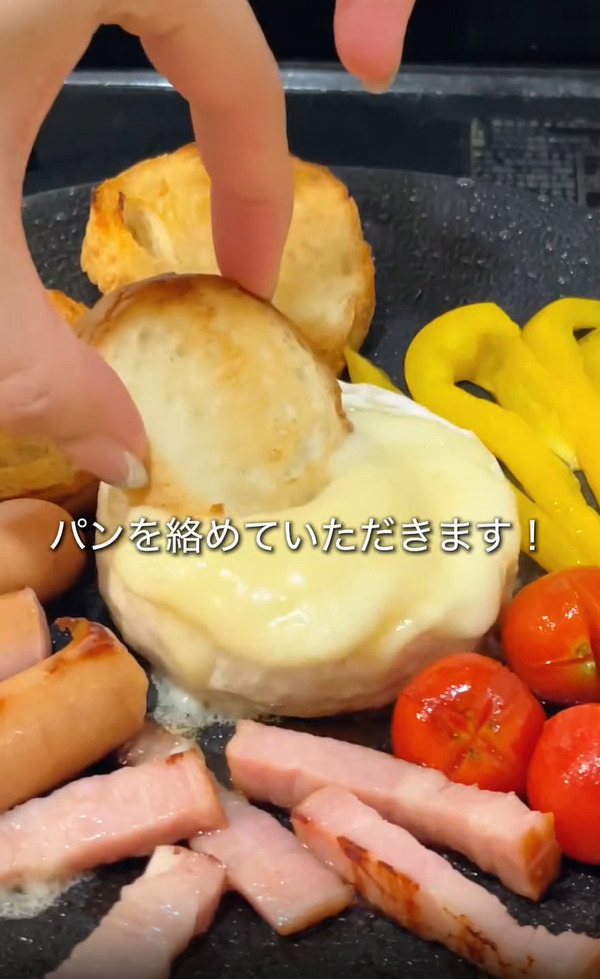 2つ目のチーズフォンデュは、パン、トマト、ソーセージなど好みの具材とカマンベールチーズを並べて加熱するだけ。チーズがとろけてきたら、具材をからめて楽しめます。“おうちごはん”をワンランクアップさせてくれそうなアイデアですね。