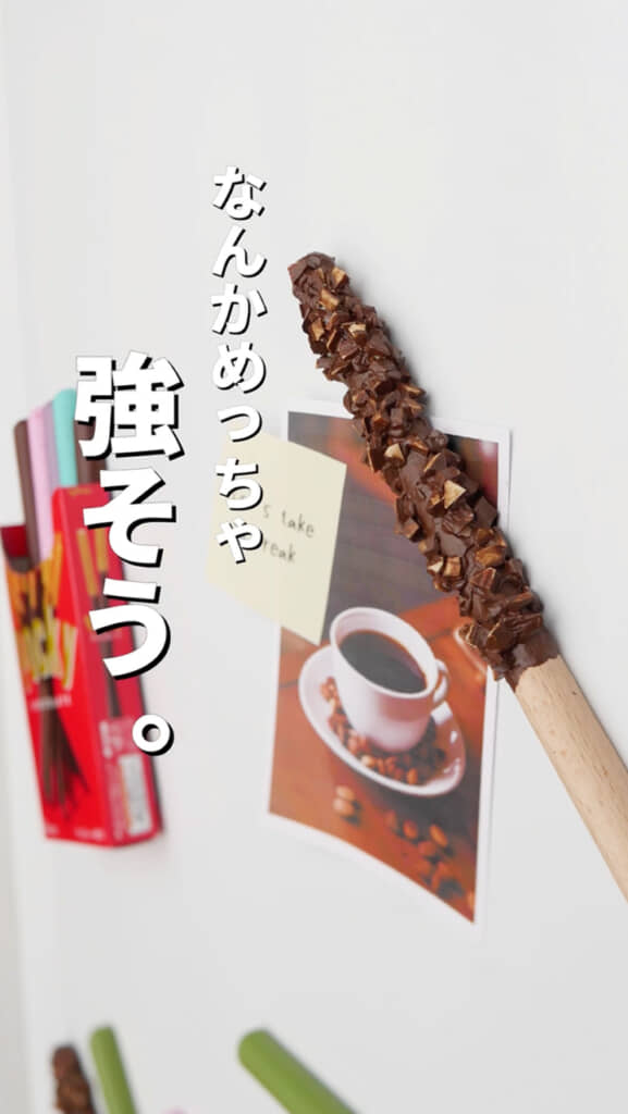 チョコの色をちょこっと変えれば自分好みのポッキーが制作可能。また、空き箱の裏にマグネットシートを貼って、ポッキーマグネットを収納するだけで、かわいいインテリアにもなります。いざという時は、護身用にもなるかも……?