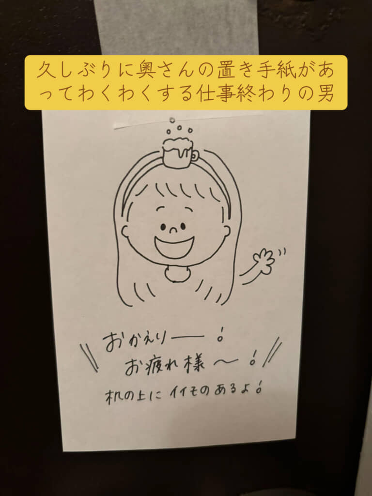 「久しぶりに奥さんの置き手紙があってわくわくする仕事終わりの男」と紹介されたのは、「おかえりー! お疲れ様ー! 机の上にイイものあるよ!」と書かれたメモ用紙。女性がにこやかに手を振っているイラストが添えられています。イラストはゆるいタッチでかわいらしく、よく見るとなみなみ注がれたビールジョッキのカチューシャを頭に着けているようです。