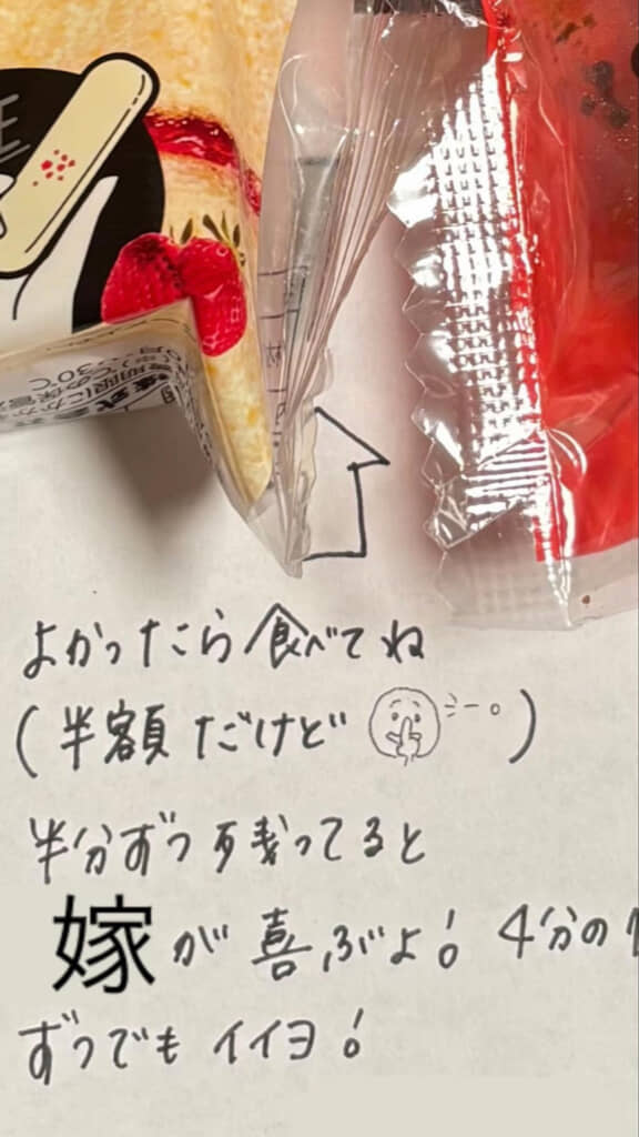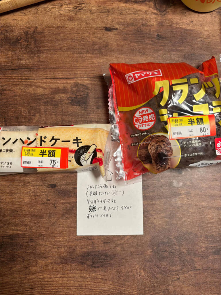 机の上には、半額の値引きシールが貼られた2つのお菓子が。そしてその下にはさらに手紙が置かれていて、「よかったら食べてね」「半分ずつ残っていると喜ぶよ! 4分の1ずつでもイイヨ!」と書かれています。「半額だけど」とのかっこ書きには「シー」と口の前に人差し指を立てるイラストが添えられ、これまたゆるいタッチがかわいらしいです。