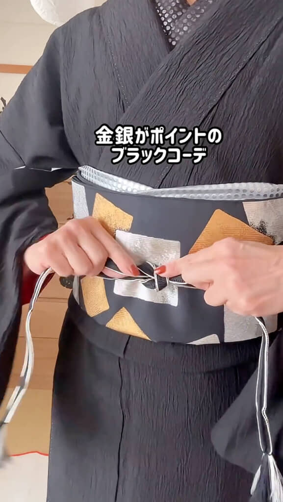 いつもより少し衿を開けて着物を着つけたら、次に黒地に金と銀の四角模様が入った帯を締め、仕上げに帯揚げと帯締めを結んでいきます。ちなみに、四角模様を選んだ理由は本や紙をイメージさせるからだそうです。