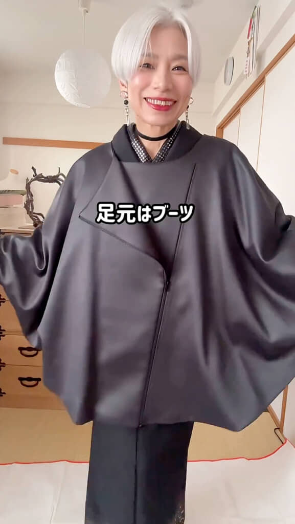また出かける際は、コートにライダースポンチョ、足元にはブーツを合わせたとのこと。着物にあえて洋のものを取り入れることで、フォーマル過ぎず、ちょっとしたパーティ仕様のコーデにしたそうです。