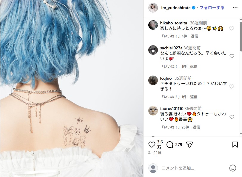 ネコや王冠、蝶結びのリボンを描いたデザインで、アイドル時代には決して見られない姿に「てっちゃんがどんどん変わっていく!」「タトゥーもかわいすぎ」「タトゥー??! 最高です」などの反響が寄せられていました。