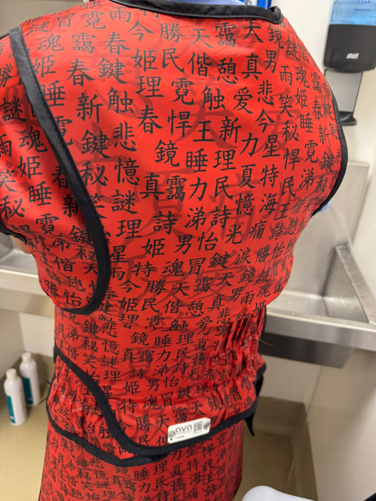 見ると、真っ赤な生地に漢字がところ狭しと配置されています。「力」や「王」といったおなじみのものだけではなく、日本では見かけないような、画数の多い難読漢字までさまざま。まさに「耳なし芳一」っぽさあふれるデザインですね。どうしてこうなった……?