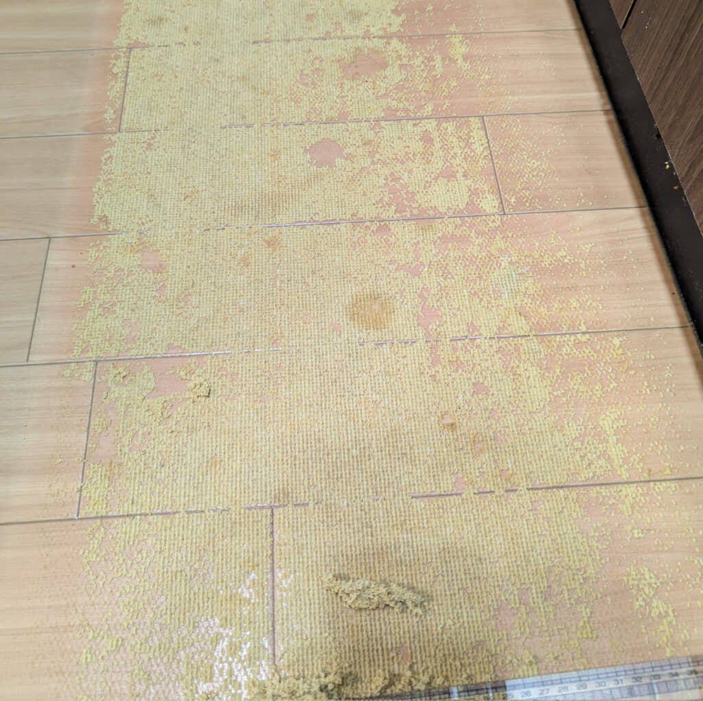 見ると、キッチンマットを敷いていた床に、べったりと黄色い物質が! キッチンマットの滑り止めに使われているゴムなどの素材が、経年劣化によりこびりついてしまったようです。これをきれいにするのは大変そうだ……。