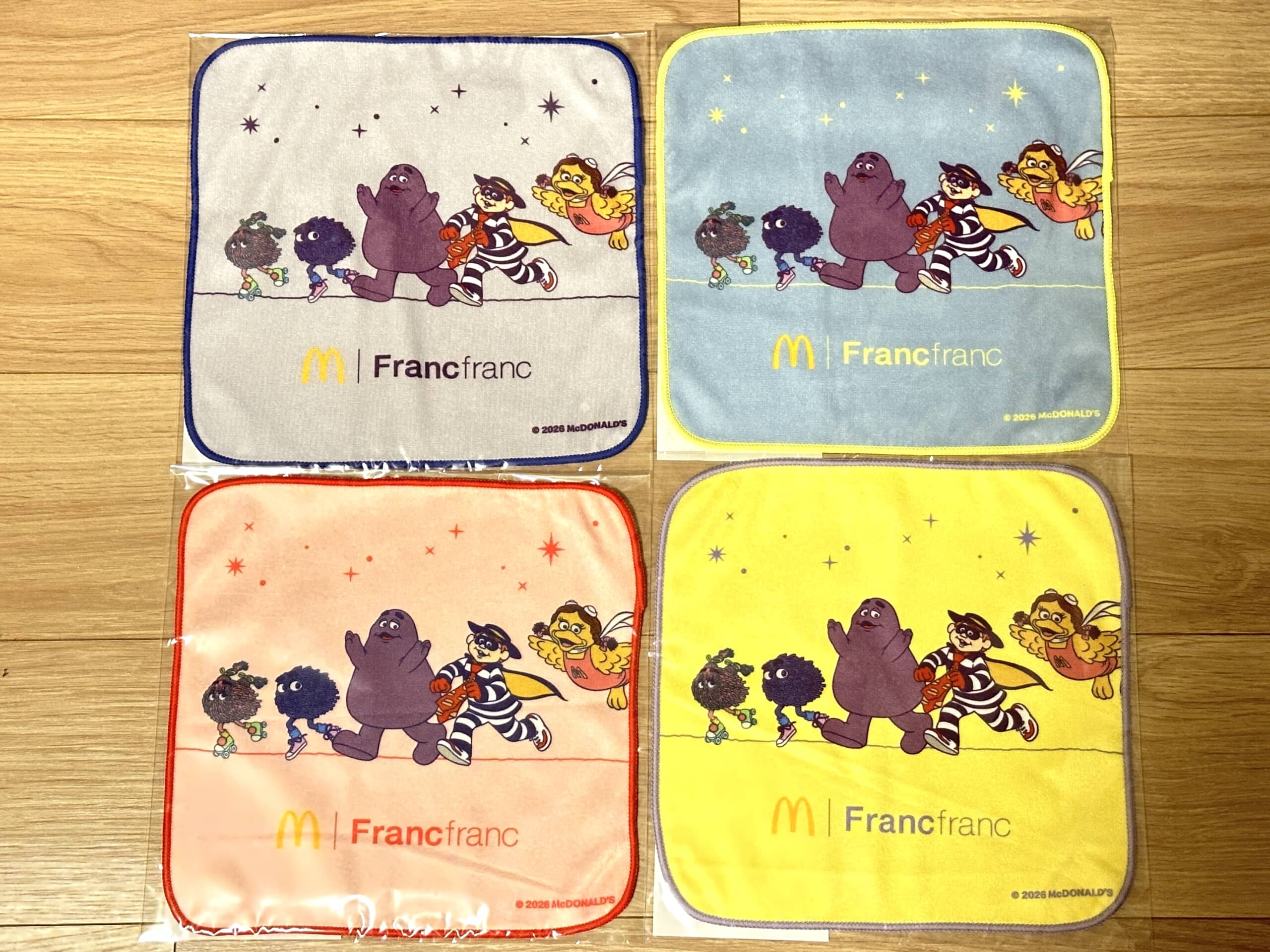 パステルカラーを基調としたハンドタオルに、グリマスやハンバーグラーたちマクドナルドファミリーが大集合! 保温・保冷バッグと同様のカラーのほか、パープルをベースとした色合いも加わり、全4種類のうち1種類が福袋に入っています。