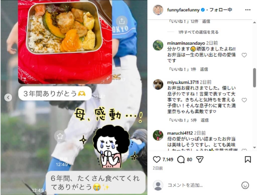 しかし続く投稿で、「3年間ありがとう」と感謝のコメントを送った息子に、“母、感動……!”というス感涙した女性のスタンプに添えて「6年間、たくさん食べてくれてありがとう」と返したやり取りを切り取った写真も投稿しました。