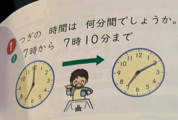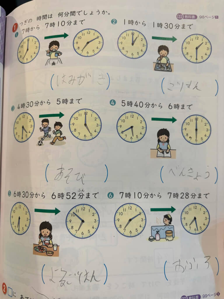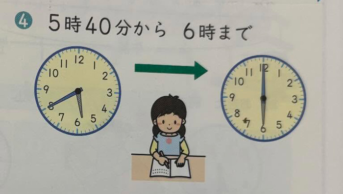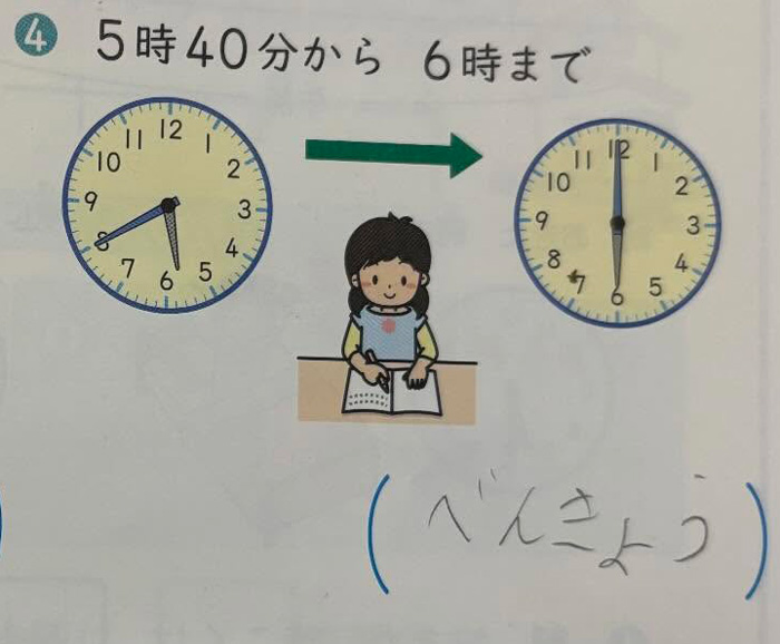 他にも4問目は「5時40分から6時まで」という問題とともに、その下にはこれまで同様に勉強をしている子どものイラストが。このパターンはやはり……?