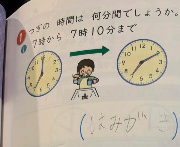 「10分間」という解答が正しい1問目に対して、さんの解答は、「はみがき」。どうやら、時計と一緒に描かれていた、“子どもがしている行動”を解答してしまったようです。