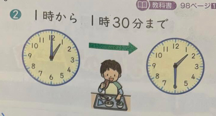 続く2問目は、「1時から1時30分まで」の時間を答える問題。1問目と同様に時計や、その下には昼ご飯を食べる子どものイラストが描かれています。