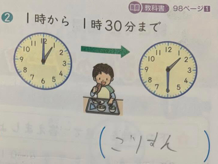 そして、息子さんは、「ごはん」と解答。正しくは「30分間」ですが、イラストの子どもから解答を導き出したようです。