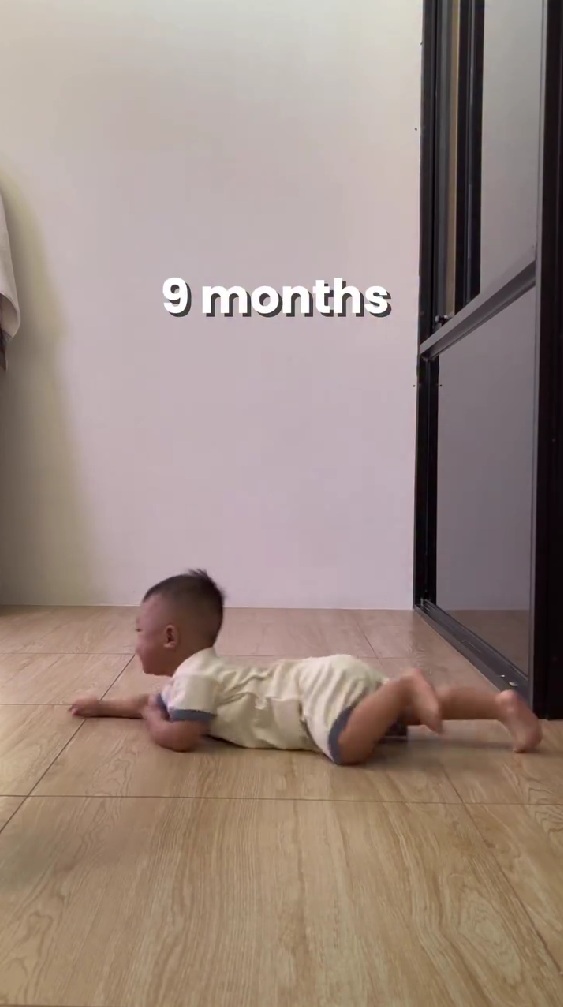 今回紹介するのは、9カ月の赤ちゃんの5カ月間の成長を記録した動画です。最初のシーンは9カ月のころの赤ちゃんの様子。赤ちゃんはうつ伏せの姿勢で、腕を前に突き出しながら床をズリズリと進んでいます。いわゆる“ほふく前進スタイル”で、一般的なハイハイの形にはまだなっていません。