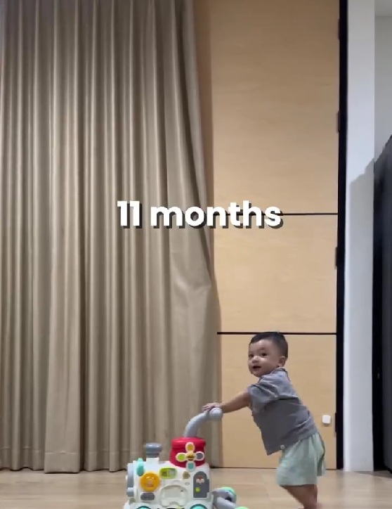 11カ月になると、まさかのつかまり歩きデビュー。手押し車をぎゅっと握りしめ、楽しそうに前進していく姿が映っています。ズリバイだった9カ月から、たった2カ月後に立って歩くための練習をしているという劇的な変化に驚かされます。少し不安定ながらも、しっかり足を踏みしめて前に進む姿に成長の早さを感じます。