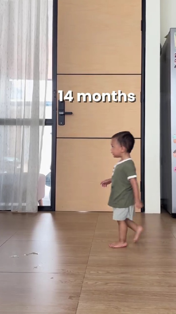 そして最後の14カ月のころには、赤ちゃんは、もう完全に幼児の歩き方になりました。足元をしっかりさせ、両腕を自然に下ろし、まっすぐ前に向かってスタスタと歩いています。別のカットでは、歩きながら手に持ったカップをのぞき込む余裕まで見せています。歩くだけで手いっぱいだった時期をすでに脱し、同時にほかの動作もできるようになったことに感動してしまいます。