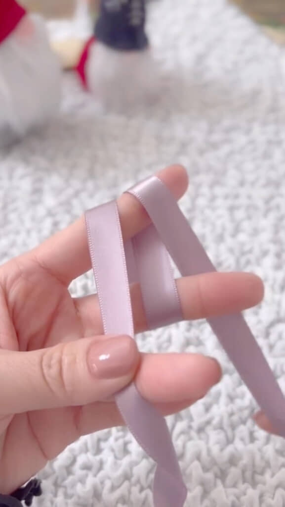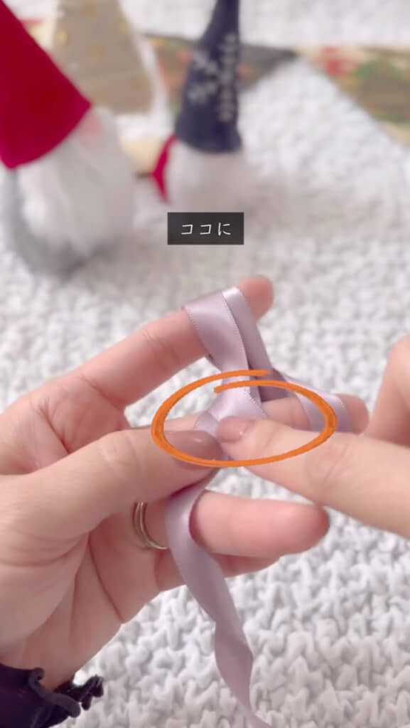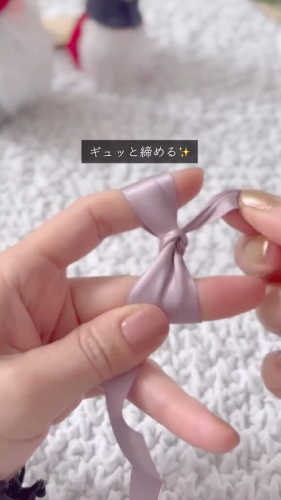 すると、中指の方に輪っかができるので、そこにリボンの端を入れ込み、バランスを見ながらギュッと締めます。あとは、指から外してたれ(リボンの下部分)をカットすれば……あっという間にダブルループリボンが完成です!