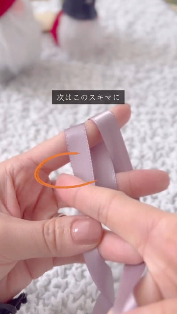 まずは、手のひらにリボンを置いて、人差し指と中指に8の字になるように巻きつけていきます。次にリボンの端を指の間にできた隙間に通し、上に持っていきます。