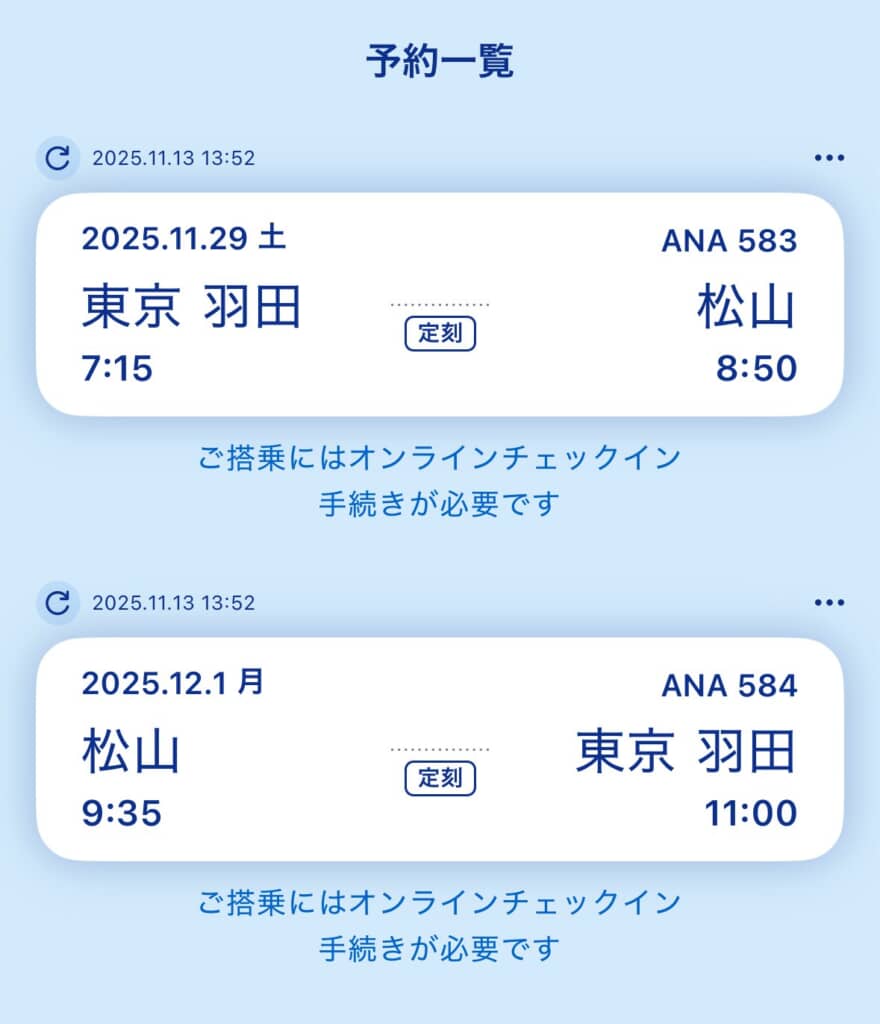 今回予約したのは、11月29日の「羽田空港→松山空港」の便と、翌々日12月1日の「松山空港→羽田空港」の便。ぱっと見の違和感はありませんが……なんとサカモトさんは愛媛県在住なので、羽田と松山を逆にした便を予約してしまったことになります。これは確かに胃が痛い!