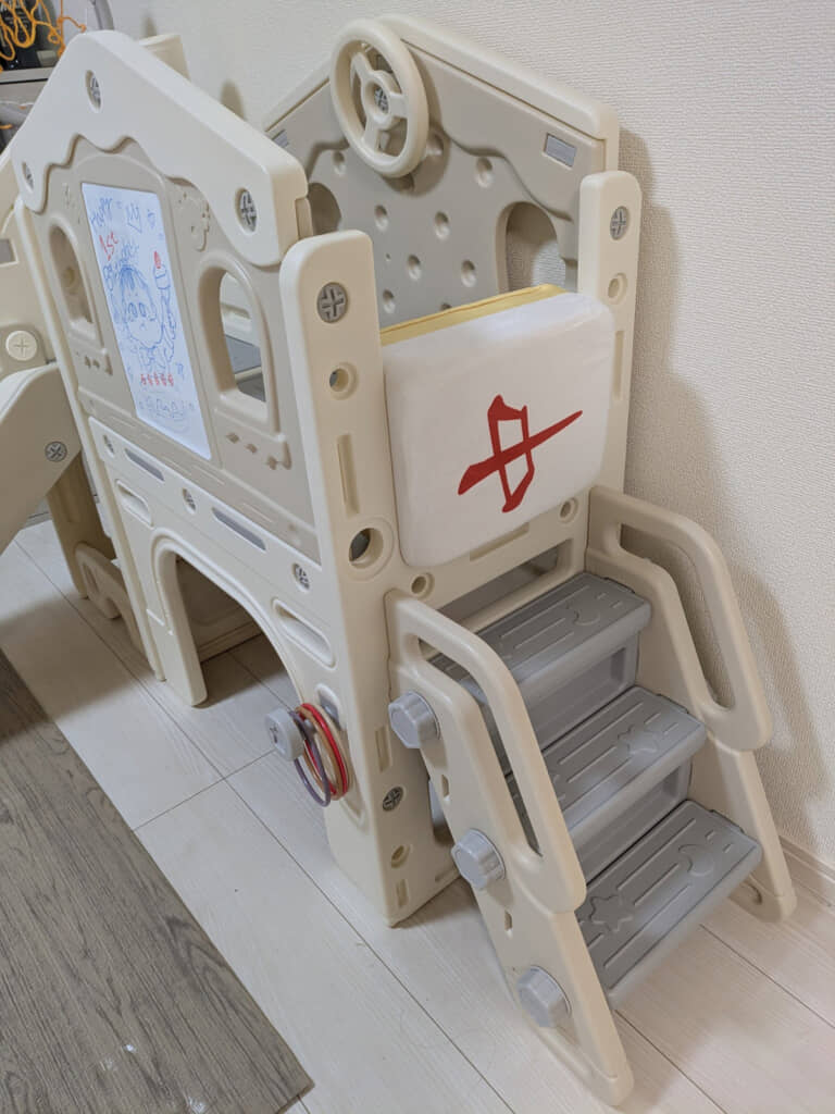 投稿者は、Xユーザーの最中もなか(@mona_inuki)さん。「まだ上れない階段は『中』で塞(ふさ)いである」と添え、自宅に設置している子ども用のすべり台の写真を披露しました。