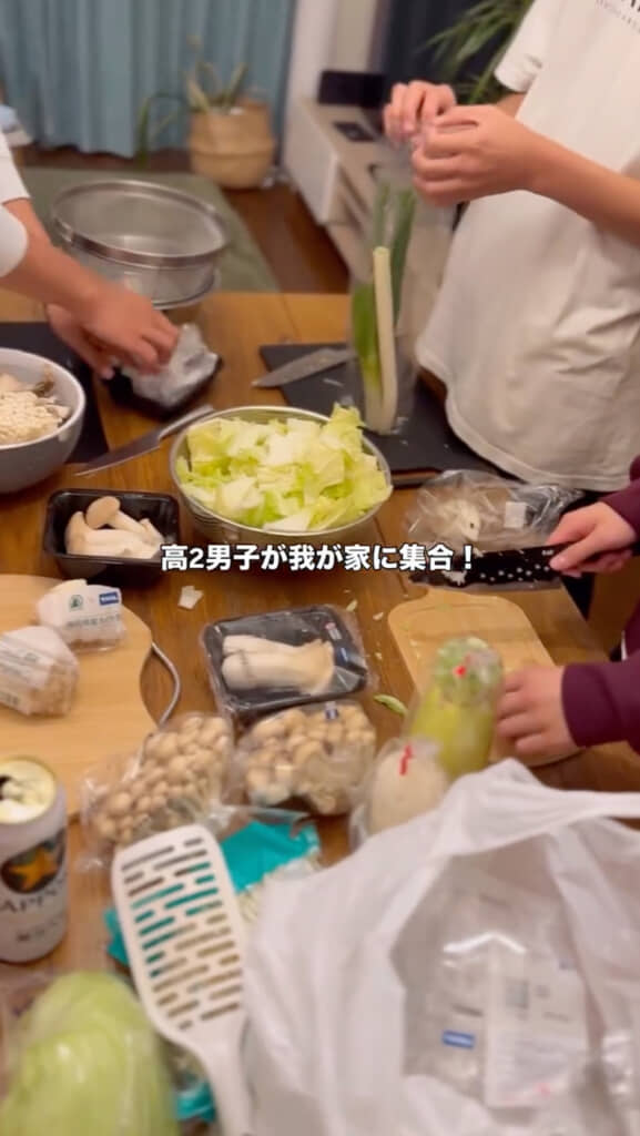 修学旅行前日、前夜祭をするために次男を含めた男子高校生5人が自宅に集合。この日の晩ごはんは、体が温まる鍋だそうでさっそくみんなで準備を始めていきます。なお食べ盛りの男子たちのために、yukoさんは別で煮物も用意していたそうです。