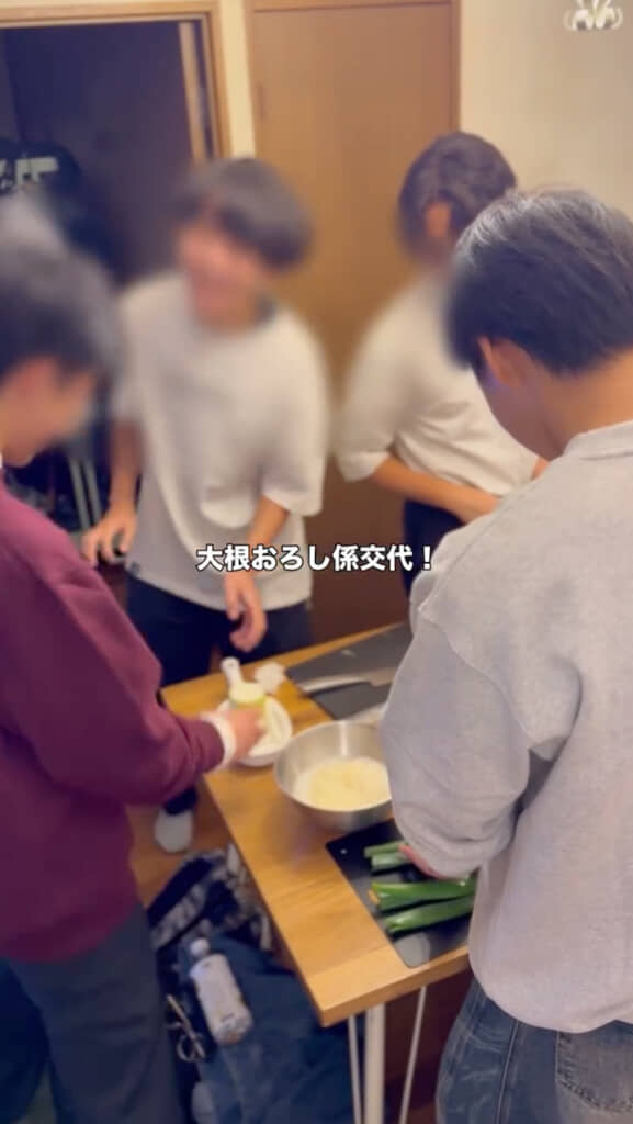 テーブルにはたくさんの具材が並べられており、野菜を切る係や大根おろし係などみんなで役割分担。途中、腕が疲れたのか大根おろし係が交代する場面もありましたが、あっという間に準備が整いました。