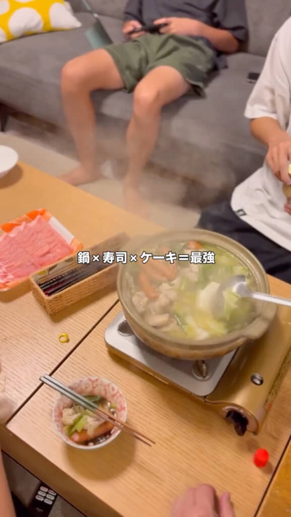しかし、食卓をのぞいて見ると……そこには鍋と煮物の他になんとお寿司が! さらに、デザートにはケーキを用意。“修学旅行前夜祭”ということで豪華なメニューにしたようです。ごちそうがずらっと並び、部屋の中は終始にぎやか。まるで、ひと足早く“思い出作り”が始まっているような雰囲気でした。