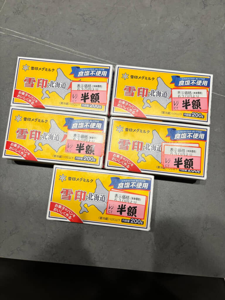 NRさんが入手したのは、雪印メグミルクの「雪印北海道バター 食塩不使用」の200グラムが5箱。すべてに半額シールが貼られており、本来は本体価格1個630円のところ315円というお得な価格で入手できたようです。