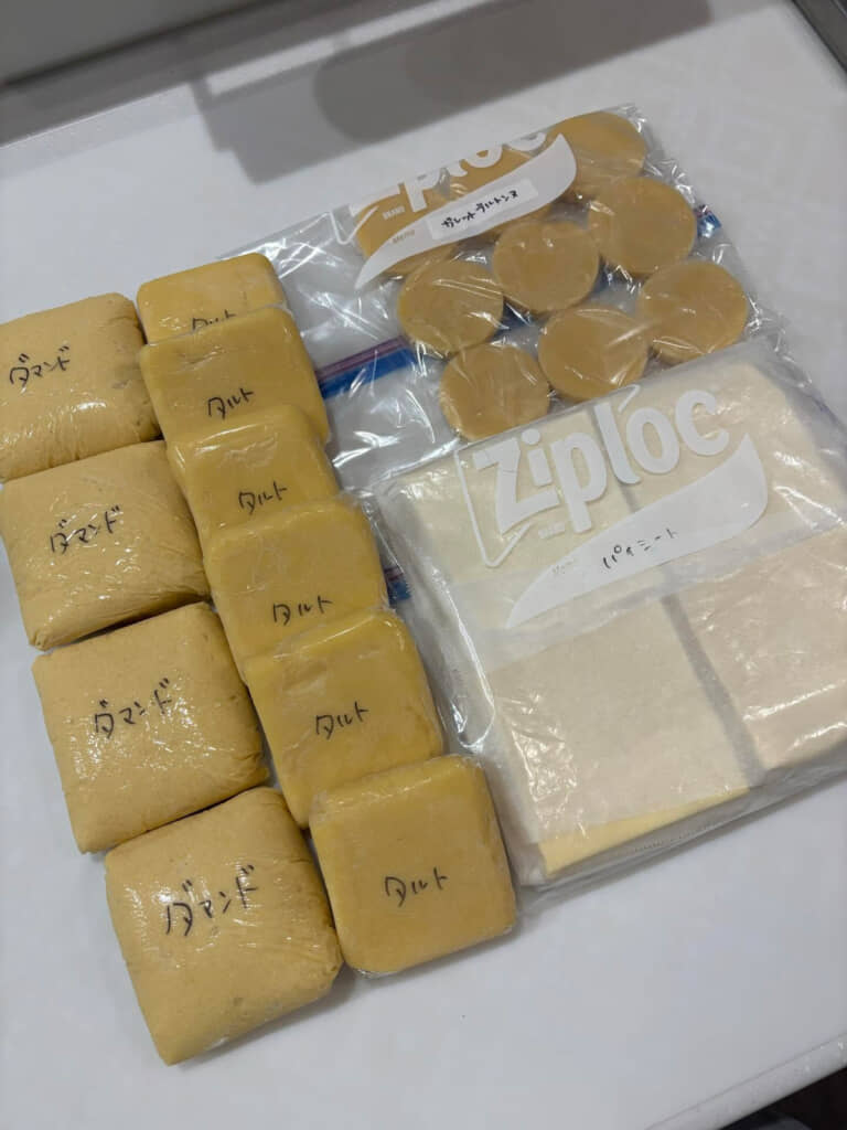 ダマンドやタルト、ガレットブルトンヌと書かれたものが計20個近く、サランラップやジップロックに包まれています。あとは焼くだけの状態にして、いつでもすぐ調理できるように保存しました。「全部使った事に自分でも引く……笑」というNRさんですが、バターを余すことなく有効活用できてよかったですね!